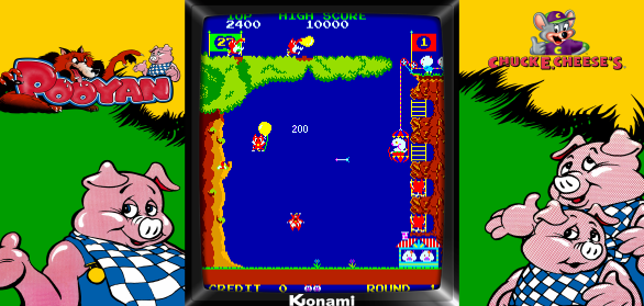 The arcade game released in 1982 by Konami Industry Co. Ltd. is an engaging and unique shooter that blends charming graphics with challenging gameplay. Set in a colorful, whimsical forest, players take on the role of a mother pig protecting her piglets from a pack of hungry wolves.