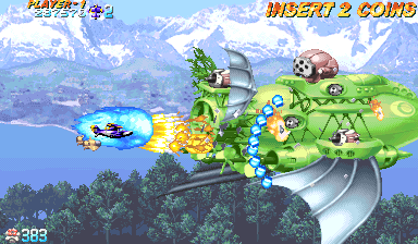 Set in a steampunk-inspired world, players take on the role of young pilots fighting against an evil empire. The game is distinguished by its horizontal scrolling gameplay, a departure from CAVE’s traditional vertical scrolling shooters. Players choose from different characters, each with unique abilities, as they navigate through a series of visually impressive levels filled with enemy ships and complex bullet patterns.