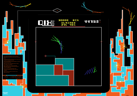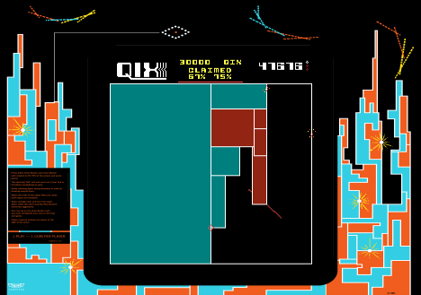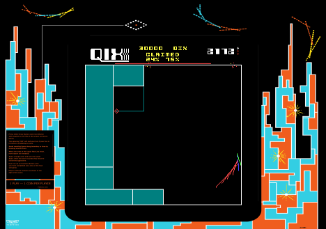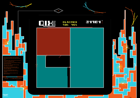 Players control a marker to draw lines and enclose areas on the screen, while avoiding enemies that patrol the grid. The goal is to claim as much territory as possible without getting caught. The challenge lies in balancing risk and reward, as moves must be calculated to succeed.
