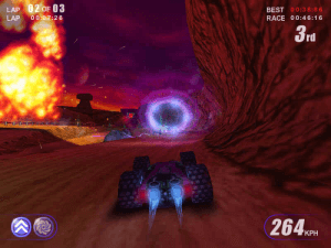 Players are immersed in high-speed races where not only dexterity and speed are vital, but also the strategic use of various power-ups and weapons scattered throughout the tracks. The environments range from futuristic urban landscapes to desolate and alien planets, offering distinct challenges and visual diversity.