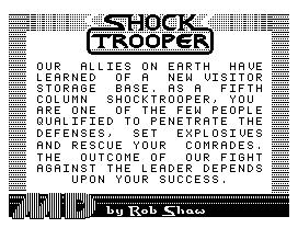 Released in 1986 by Mark Data Products, Shock Trooper is an action-packed video game that offers players an immersive arcade-style experience. Set against a backdrop of escalating conflict, the game challenges players to navigate through diverse terrains, battling enemy forces to achieve their mission objectives.