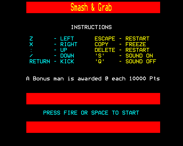Smash and Grab is a classic video game released in 1984, known for its engaging gameplay mechanics and distinctive charm from the era. This game captures the essence of early video gaming with its pixelated graphics and straightforward objectives, making it a nostalgic piece for retro gaming enthusiasts.