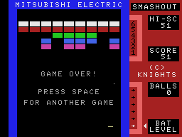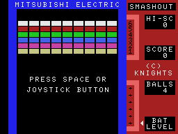 I’m sorry, but I could not find any information on a video game titled ‘Smash Out’ from 1984 developed by ‘Knights’. It seems like this game may not be well-documented or widely recognized. If you have any other questions or need information on a different topic, feel free to ask!