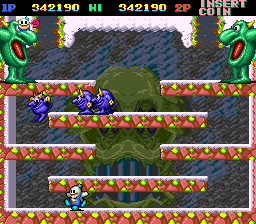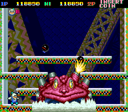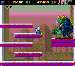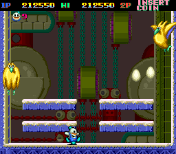 Snow Bros. Nick & Tom is a classic arcade game developed by Toaplan, released in 1990. The game features two snowman brothers, Nick and Tom, who battle through an array of monsters to save two princesses abducted by a wicked sorcerer.