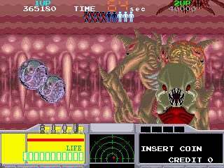 The graphics are characteristic of early 90s arcade games, offering vibrant visuals and detailed alien designs. The soundtrack complements the intense gameplay, providing an atmospheric backdrop as players navigate the perilous environments.