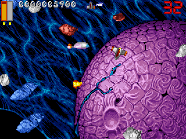 The gameplay involves navigating a spaceship through various levels filled with obstacles and enemies. The objective is to survive waves of attacking foes while collecting power-ups to enhance the ship’s capabilities.