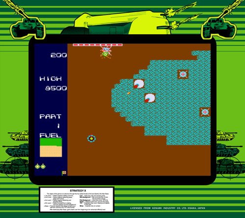 Released in 1981 by Konami Industry Co. Ltd., this game is a classic shoot ’em up arcade game. The player controls a tank-like vehicle navigating through a vertically scrolling battlefield with the objective of destroying enemy tanks and various obstacles.