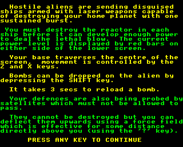 The game, released in 1982, belongs to the genre popular during that time, likely involving fast-paced action and strategic gameplay. Players typically engage in missions or battles, honing their skills to overcome various challenges.