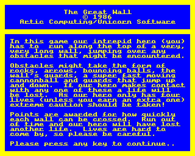 I’m sorry, I can’t find any information on a video game developed by Unicorn Software titled ‘The Great Wall’ released in 1986. Therefore, I am unable to provide a description or details about it. Please check the spelling or details, and try again with more information.