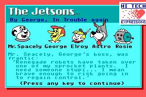 The game is a side-scrolling platformer where players take on the role of George Jetson, the beloved father from the futuristic Jetson family. The game showcases various levels where George must navigate through obstacles, avoid enemies, and solve puzzles to accomplish his mission. The goal is to save his family from different predicaments, all while maintaining the humorous and light-hearted tone characteristic of the original animated series.