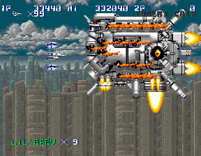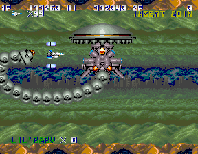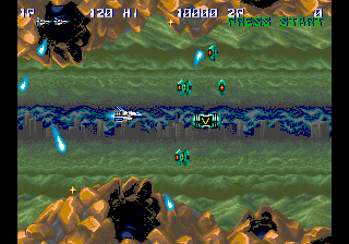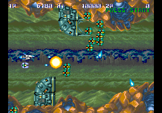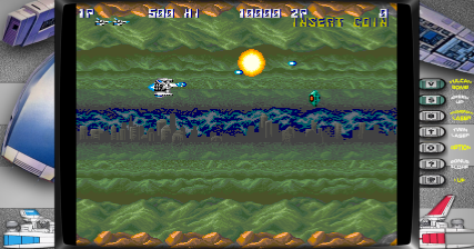 Players navigate through horizontally scrolling levels filled with waves of enemy ships and environmental hazards. As the game progresses, players can collect power-ups, such as shot upgrades and additional satellites that enhance their ship’s capabilities. The challenge intensifies with each stage, requiring players to master enemy patterns and strategically upgrade their arsenal.