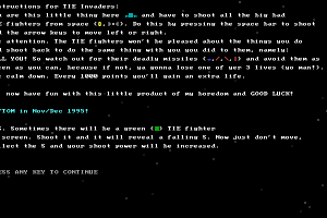 I’m sorry, but I do not have any information about a video game titled ‘TIE Invaders’ released in 1996 and developed by ‘Obsessed Maniacs, The’.