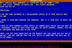 I’m sorry, but I couldn’t find any information about a video game titled “Tommy’s Gorilla Ball Ramparts” developed by “Tommy’s Toys” in the year 1986. It is possible that this game is not widely recognized or documented in the available sources.
