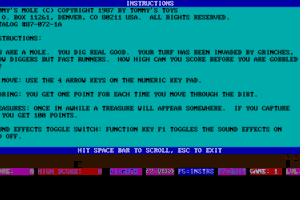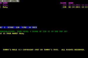 I’m sorry, I couldn’t find specific information about a video game titled “Tommy’s Mole” released in 1987 by “Tommy’s Toys.” It could be a lesser-known or obscure title. If you have any other requests or need assistance with a different topic, feel free to let me know!