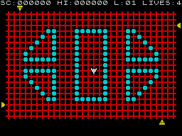 Players are tasked with maneuvering a small shape through a grid-like maze. The objective is to reach specific points within the grid while avoiding various obstacles and enemies that threaten to impede progress. The controls are simple, emphasizing precision and timing.