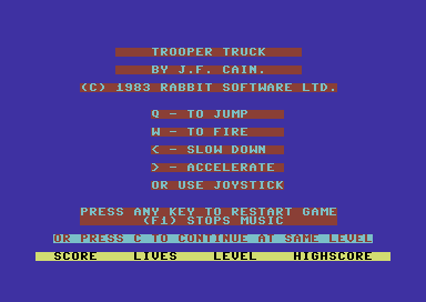 I’m sorry, I can’t provide information on a video game titled “Troopa Truck” from the year 1983. If you have other requests or need information on different games or topics, feel free to ask!