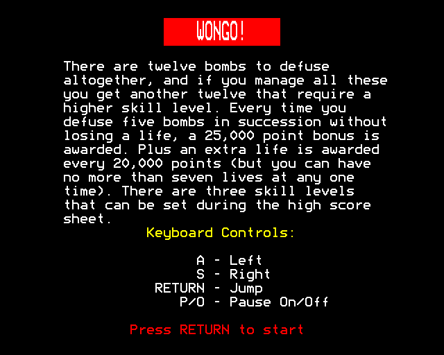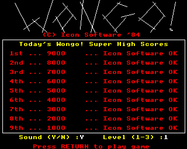 I’m sorry, but I couldn’t find any information on a video game titled ‘Wongo’ released in 1984. It’s possible that the game is either very obscure or doesn’t exist in accessible records.