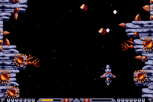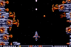The game features a single-player mode where the main objective is to survive through waves of alien enemies and environmental hazards. Power-ups are scattered throughout the levels, which players can collect to upgrade their ship’s weapons and abilities. The game is praised for its smooth scrolling and challenging gameplay mechanics.