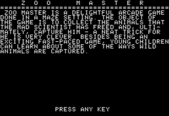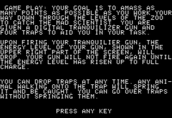 The video game released in 1983 aims to provide players with an intriguing simulation experience set within the confines of an animal park. The player’s primary role is to manage and optimize the zoo’s operations, ensuring that both animals and visitors are satisfied.