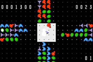 The game involves a grid where players must eliminate colored shapes by matching them with corresponding colors. The player’s piece, located in the center of the play area, can shoot in four directions to swap and eradicate lines of matching colors. The game tests players’ reflexes and strategy as speeds increase progressively, making it a fun yet frantic experience.