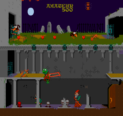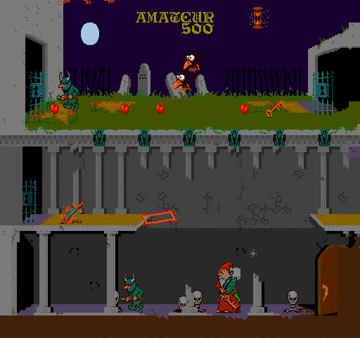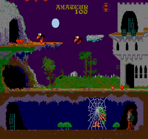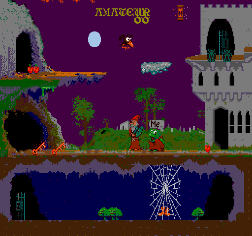 Players navigate through levels filled with various foes and obstacles. The game introduces a unique mechanic where players collect special items to cast spells. These spells can be used strategically to defeat harder enemies or navigate complex areas, adding a layer of depth to the traditional action gameplay.