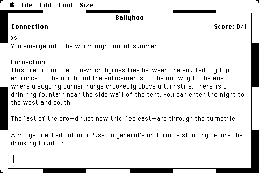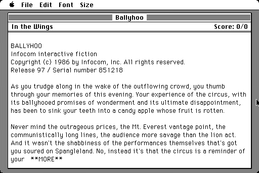 Step right up and enter a world of mystery, intrigue, and the vivid excitement of the circus in this classic interactive fiction game. Players are pulled into a narrative that combines the glamour and grit of circus life with a compelling mystery that needs unraveling.