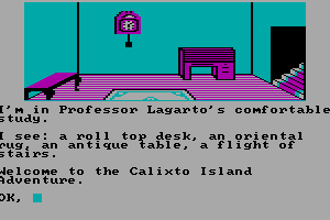 Calixto Island is an interactive fiction game released in 1984 by Mark Data Products. It is an adventure game that transports players to a mysterious island with a goal to explore, solve puzzles, and uncover secrets. The game leverages a text-based interface common in that era, allowing players to utilize text commands to interact with the environment and progress through the story.