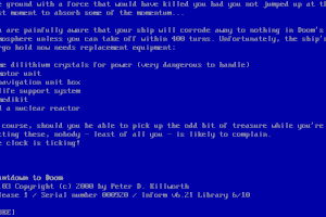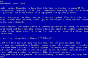 The video game released in 1987 is a classic text-based adventure game developed for the BBC Micro and Acorn Electron platforms. This title is set on a dystopian planet where the player must solve a series of puzzles to prevent an impending disaster.