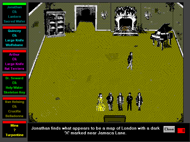 ‘Dracula in London’ is a text-based adventure game developed by SDJ Enterprises, Inc. and released in 1988. Set in the atmospheric streets of 19th century London, this interactive fiction game plunges you into a world filled with mystery and danger as you pursue the infamous Count Dracula.