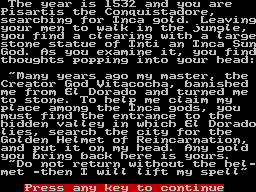 The 1985 video game offers players an engaging adventure set in the mythical city of gold. As an early computer game, it provides a simple yet captivating experience that challenges players to explore, collect treasures, and navigate through various obstacles to achieve their objectives.
