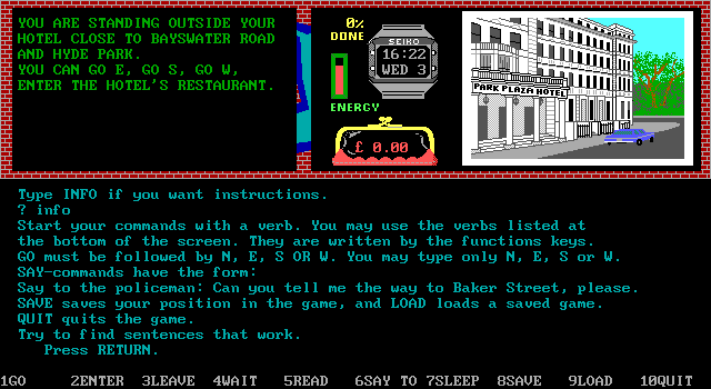 The game showcases an array of pixel art graphics that capture the essence of London’s architecture and atmosphere, despite the technological limitations of its time. The accompanying sound design enhances the immersive quality, offering ambient noises that reflect the bustling city life.