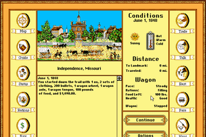 The game simulates a wagon train journey across the 19th-century American frontier. Players assume the role of a wagon leader guiding a group of settlers from Independence, Missouri to Oregon’s Willamette Valley. Along the journey, players must make strategic decisions about purchases, members of their party, and the route they take, while managing resources such as food and supplies.