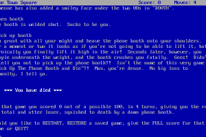 The game places the player in a peculiar scenario where the primary objective is inherent in its title: you are presented with a phone booth, and your task is to pick it up, which, humorously, leads to an immediate end — you die. Despite its simplicity, this design pokes fun at more complex interactive fiction adventures by subverting player expectations.