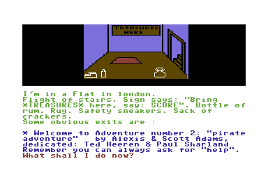 The gameplay involves navigating through a pirate-themed environment, solving various puzzles that require wit and strategy. Players use text commands to interact with the game world, engaging in treasure hunts and navigating their way through challenging scenarios. The inclusion of graphical elements provides visual cues that assist players in solving the puzzles, adding an additional layer of engagement to the classic text-based format.