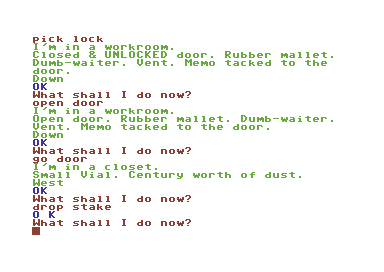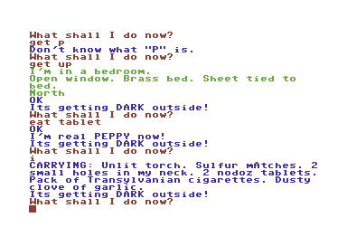 In this text-based adventure, players find themselves navigating through various locations using typed commands. The game interface is purely textual, focusing on narrative and decision-making. Players input actions to interact with the environment, manipulating objects and interacting with characters they encounter.