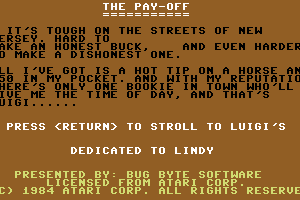 I’m sorry, but I wasn’t able to find any information on a video game titled “The Pay Off” released in 1987 by Bignose Software. Therefore, I cannot provide a description based on available data. If you have any other questions or need further assistance, feel free to ask!