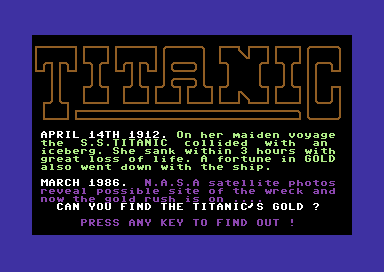 “Titanic: The Adventure Begins…” is a computer game released in 1986. It is not one of the most prominent titles associated with the Titanic theme, but it represents an early attempt to bring interactive entertainment based on the tragic historical event to a gaming audience.