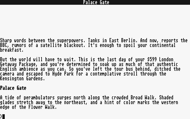 Developed by Infocom during a period known as the “Golden Age” of interactive fiction, Trinity stands out for its thoughtful narrative and high-quality writing. Infocom was known for creating complex and engaging story-driven games that challenged players intellectually while exploring expansive themes. This game is a part of that legacy, offering a profound experience that encourages reflection on real-world issues.