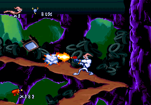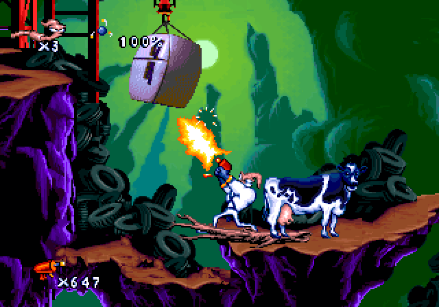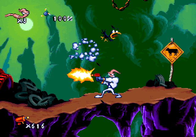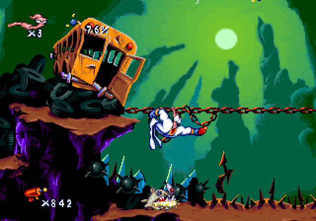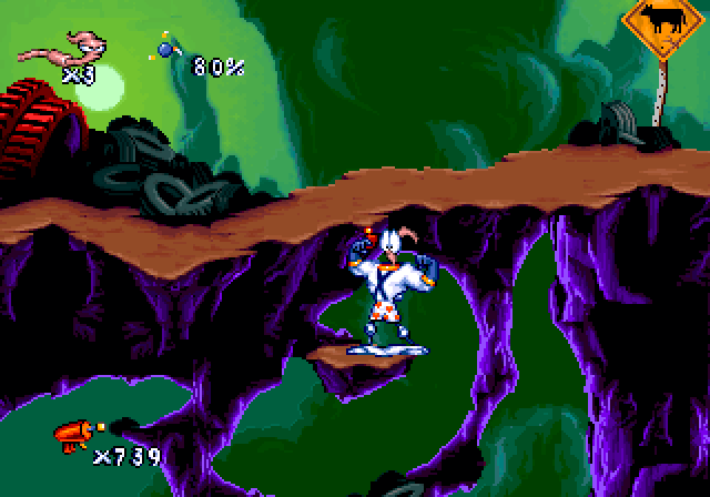 Players navigate through various platform levels, equipped with Jim’s signature abilities such as shooting, using his head as a whip, and a helicopter-like spin to slow down falls. The game combines fast-paced action with puzzle-solving elements, requiring quick reflexes and strategic thinking.