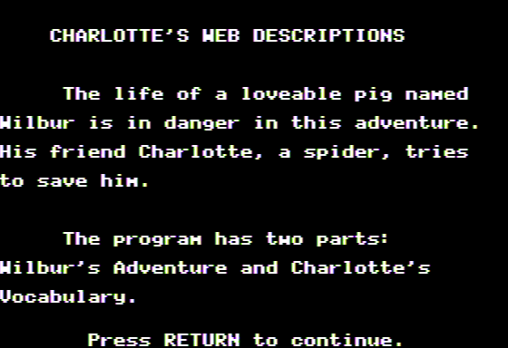 A Newbery Adventure: Charlotte’s Web is a vintage text-based adventure game that brings to life the enchanting world of a beloved children’s classic. Players navigate through the narrative by making choices that affect the course of events, often revealing different endings based on their decisions. This interactive format captures the spirit of the original tale, allowing fans to engage with the familiar story in a new and immersive way.