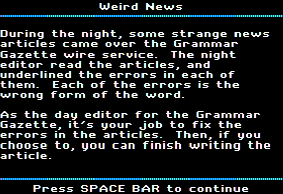 While the game did not gain widespread popularity, it holds a place in the educational gaming niche for its innovative approach to teaching language skills during the early 90s. Grammar Gazette uses a creative method to make learning grammar more interactive, providing players with a unique way to strengthen their command of the English language.