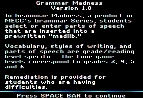 Released in 1992, Grammar Madness is an educational video game designed to enhance the grammar skills of its players through engaging gameplay. Targeted mainly at children, it features various levels and challenges that test and develop their language abilities in a fun and interactive environment.