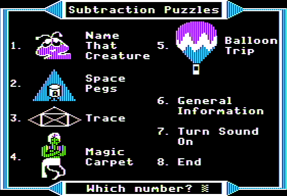 I’m sorry, I couldn’t find specific information about a video game titled ‘Subtraction Puzzles’ released in 1985. Without more details or if the game is not widely recognized, it is challenging to provide an accurate or elaborate description.