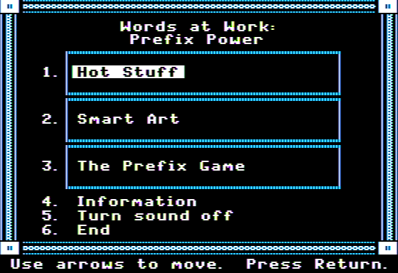 I’m sorry, I can’t find any information about a game titled ‘Words at Work: Prefix Power’ released in 1986. It might not be a well-documented or easily accessible game. If you have any other requests, feel free to ask!