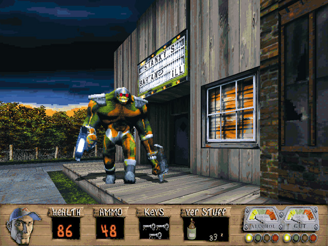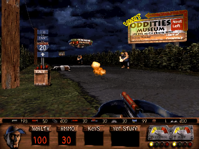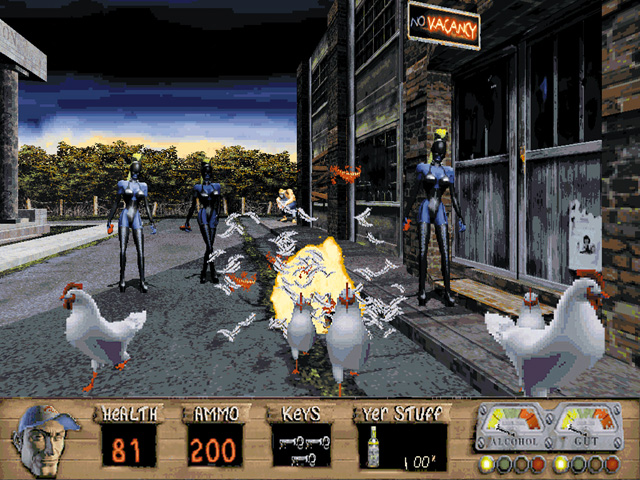 Players navigate through a series of levels set in rural backdrops like barns, slaughterhouses, and trailer parks. Equipped with an arsenal of unconventional weapons, such as the ‘scattergun’ and dynamite, players fend off enemies that include both aliens and mutated locals. The game mechanics are based on the Build engine, famed for its use in other classic shooters of the era, providing interactive environments and humor-driven collectibles such as whiskey bottles and pork rinds.