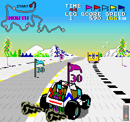 The gameplay centers around controlling a dune buggy across various themed courses. Players are tasked with racing against time while collecting flags and bonuses to boost their score. The courses feature diverse environmental elements, such as hills, bridges, and tunnels, creating an immersive and demanding racing adventure.