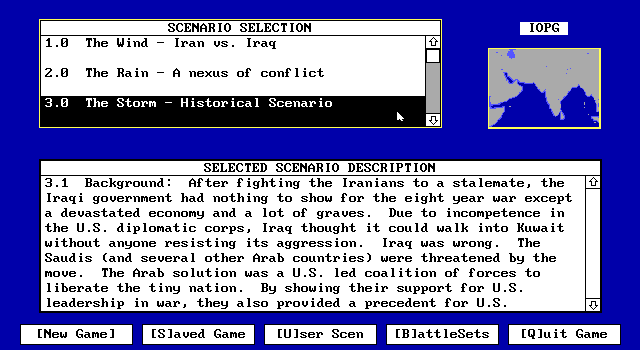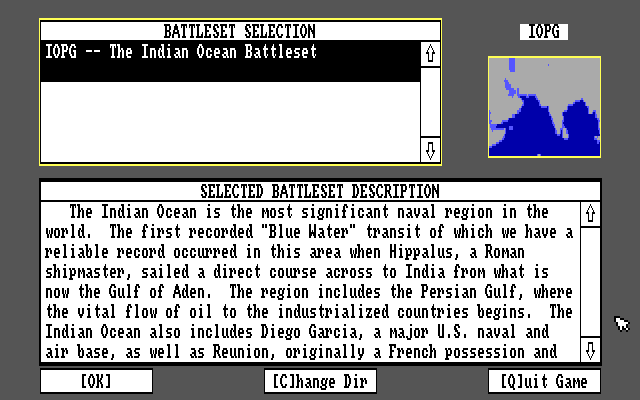 The game, released in 1991, is an expansion for the original Harpoon naval simulation series. This scenario pack brings new challenges to players by expanding the theatre of operations to the Indian Ocean and Persian Gulf. Players must command naval and air forces in complex scenarios that emphasize strategic planning and tactical execution.