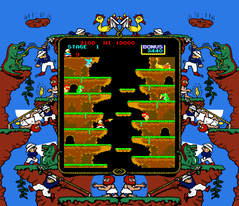 The game challenges players to ascend vertically scrolling stages, overcoming various obstacles and avoiding enemies. Armed with a harpoon-like device, players can shoot ropes to latch onto overhead surfaces, creating paths to climb up. Brightly colored environments and whimsical enemies, such as prehistoric monsters and rival explorers, add to the game’s charm. Timing and precision are critical as players must navigate moving platforms, avoid enemy creatures, and collect power-ups that enhance their climbing abilities.