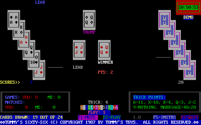 I’m sorry, but I don’t have any information on a video game titled “Tommy’s Sixty-Six” from 1987 developed by “Tommy’s Toys.”