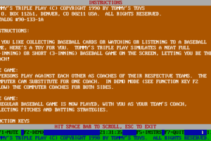 I am unable to find any specific information on a video game titled ‘Tommy’s Triple Play’ released in 1990 and developed by ‘Tommy’s Toys.’ It seems to be a title that is not widely recognized or documented in historical video game archives or databases available to me. Therefore, a description cannot be generated.